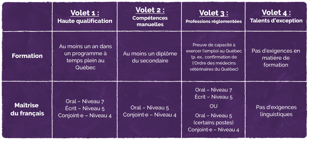 Les candidat·es au Volet 2 doivent démontrer une compétence intermédiaire en français (l’équivalent du niveau B1), ce qui n’est pas une mince affaire : selon des études récentes, la majorité des immigrant·es du Québec sont allophones – leur langue maternelle n’est ni le français ni l’anglais –, même si la part de francophones augmente.