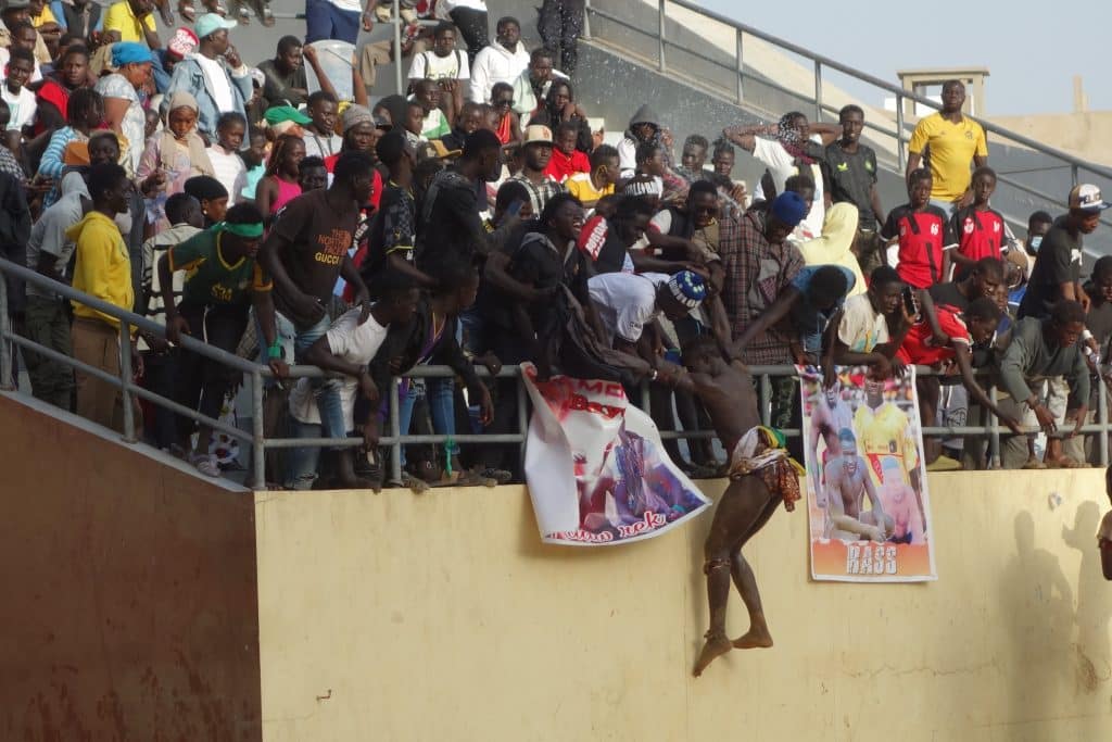 Fans from everywhere in Dakar and further come together to cheer for their favourites, rolling out banners with their star’s face, screaming their name while they fight. The atmosphere in the stadium can be heated, as fans from enemy wrestlers can sometimes engage in their own fight in the tier.
