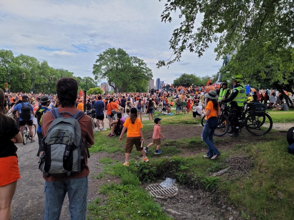 On Thursday, many people wore orange rather than white and red. The orange shirt is associated with the National Day for Truth and Reconciliation (or Orange Shirt Day), which takes place on September 30, and comes from the story of a residential school survivor, Phyllis Jack Webstad, whose new orange shirt — a gift from her grandmother — was taken from her at a residential school.