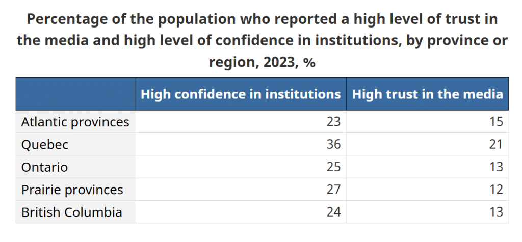 Quebec is the province that trusts news media the most, where 21 per cent of people report a high degree of confidence in the media. Obviously, a healthy dose of skepticism is never a bad thing, but it’s hard to look at a number that low and not conclude that somewhere along the way, media makers screwed up.