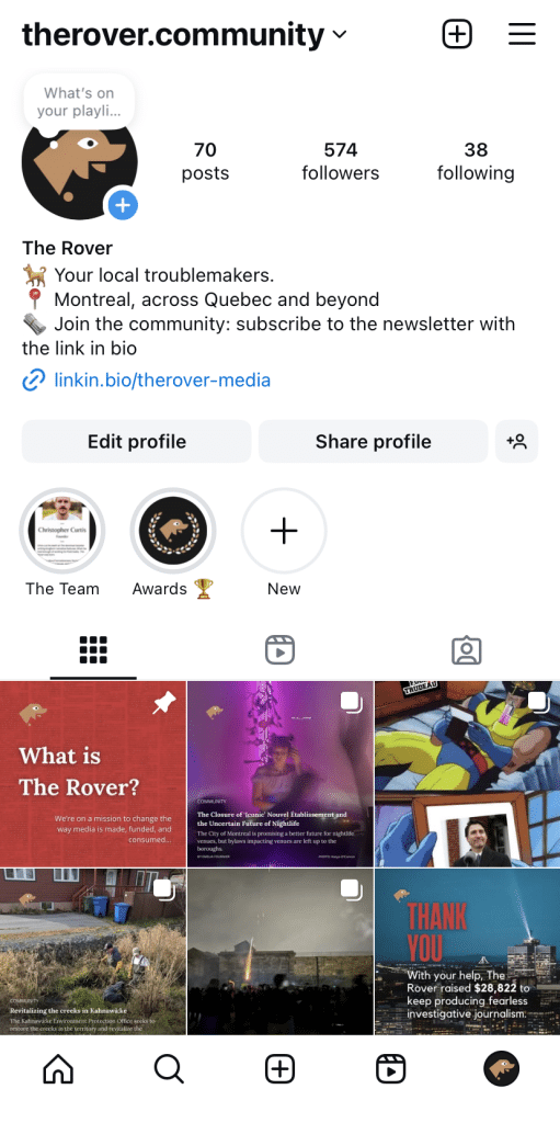 The Rover’s Instagram account, where we play the game of talking about our work without using the words “journalist,” “article,” or “news.” SCREENSHOT: @therover.community