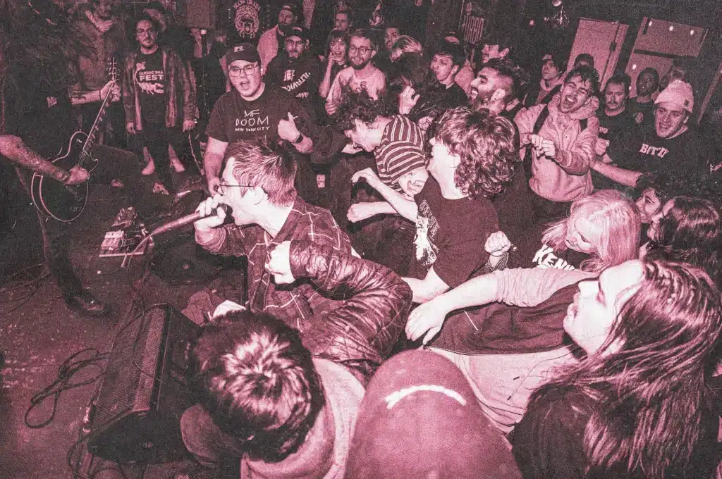 Curtis: In your work, it often feels like the line between audience and performers gets blurry. In some of your photos, I see a singer who gets right in an audience member’s face or people almost mobbing the stage. Is this specific to hardcore? And how would you even explain hardcore to someone who may never of heard it. How do you explain hardcore to my 67-year-old father. His name is Mike.