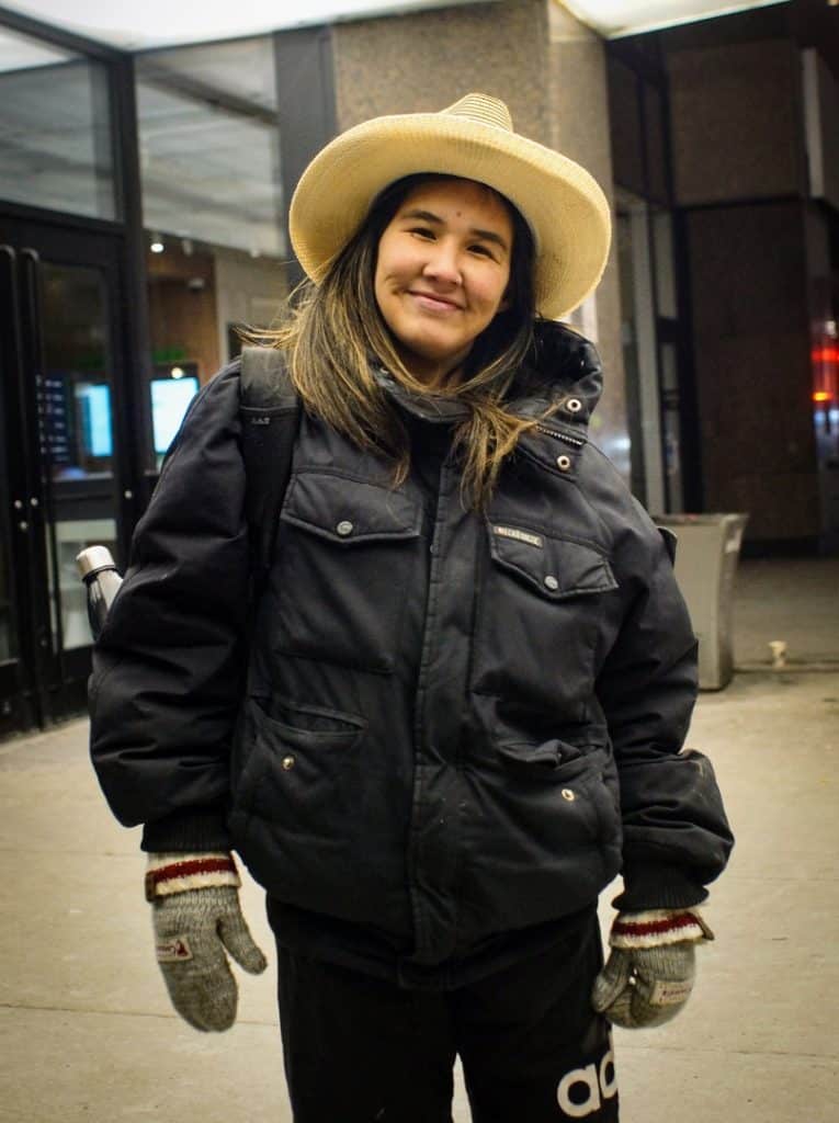Sophia, with two hats on her head and her eyes full of gentleness, listened to the whole conversation. Silent until then, she spoke… She has been in Montreal for almost a year. She is originally from Kangiqsujuaq, a small village in Nunavik. Located near Hudson Strait and Baffin Island, just 840 people share their daily lives there.