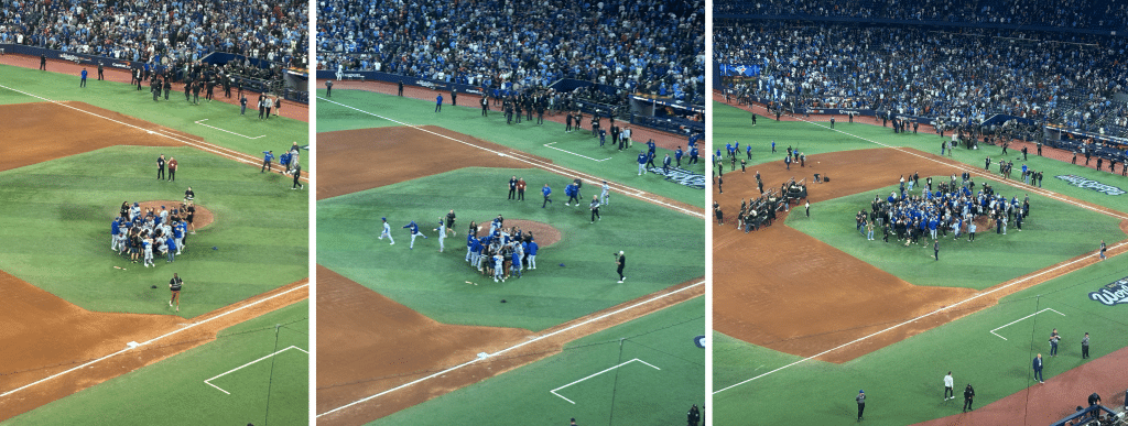 From our seats, we could see it all unfold so perfectly. I paid close attention to Jays catcher Alejandro Kirk jogging slowly off the field, carefully dodging the celebration happening on his infield, in front of his fans.