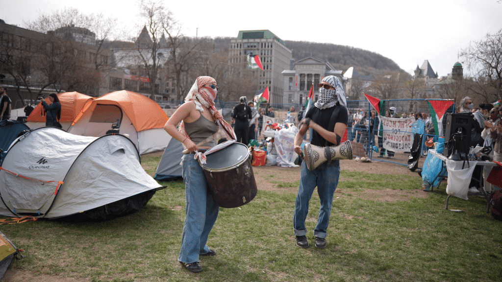 Demonstrators play drums at the encampment on McGill University campus calling for McGill and Concordia Universities to cut ties with Israel. PHOTO: Oona Barrett