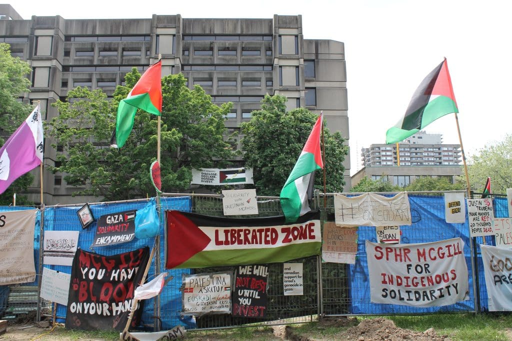 Multiple conflicts were in the air on May 31, the day of Convocation, as the Association of McGill Professors of Law (AMPL) assembled on the picket line. Families photographed graduates on campus — some including, others excluding the Palestine encampment from their photos. A woman in a blue and white dress alternated between heckling pro-Palestinian speakers and berating a bored security guard to “throw Hamas off campus.”