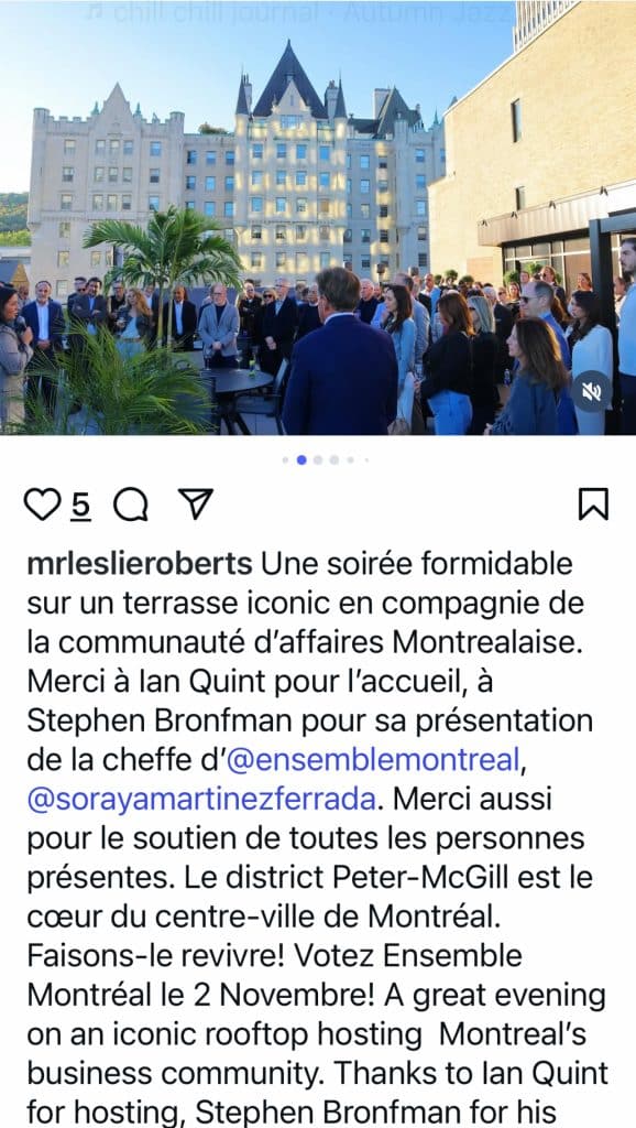 On Sept. 30, the developer and frequent Conservative donor Ian Quint hosted a cocktail party featuring Martinez Ferrada on the roof of the old Holt Renfrew building. Quint’s company, Brasswater Inc., owns and manages 13 million square feet of commercial property across Quebec.