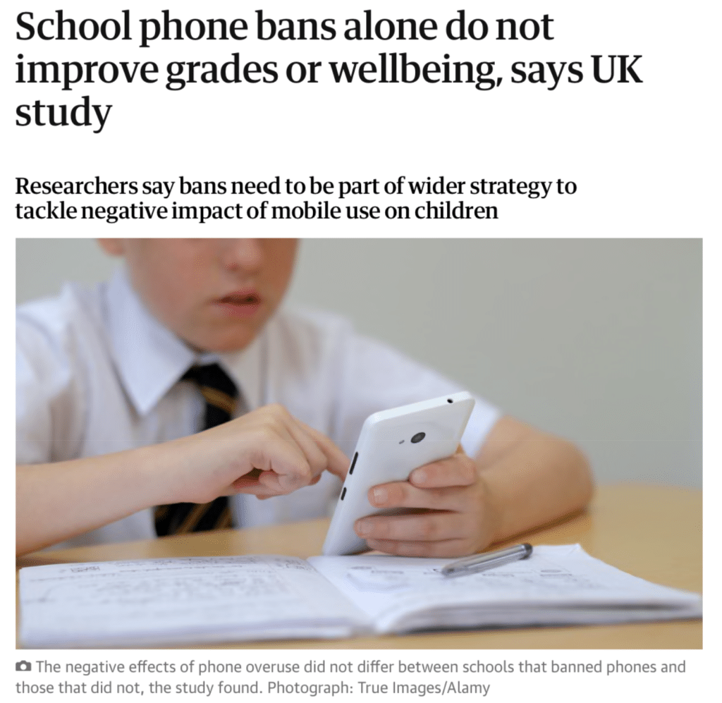 This year, The Lancet Europe published the first comprehensive study to examine the real-world impact of school smartphone bans on a wide range of adolescent health and educational outcomes. It found no major differences in mental health, sleep, or academic outcomes between schools that banned phones and those that didn’t. Screen time dropped by 40 minutes during school hours, but students made up for it at home, so the average daily screen time stayed the same (four to six hours).