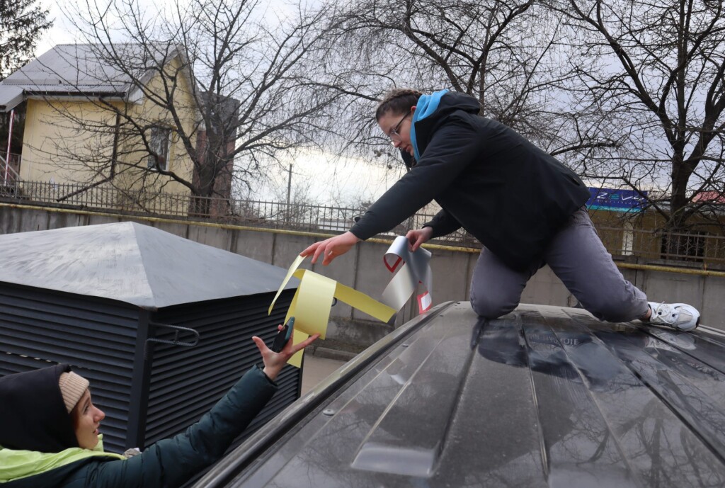 Across the city at Ridni Orphan Centre, workers brace themselves for an influx of children who were in foster care and those newly orphaned by the war. A young woman stood atop a van loaded with humanitarian supplies, rubbing a cross-shaped sticker onto the roof in hopes that it will dissuade helicopters from firing at the vehicle.