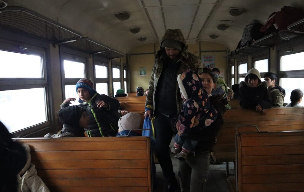 Refugees board an old Soviet train to safety