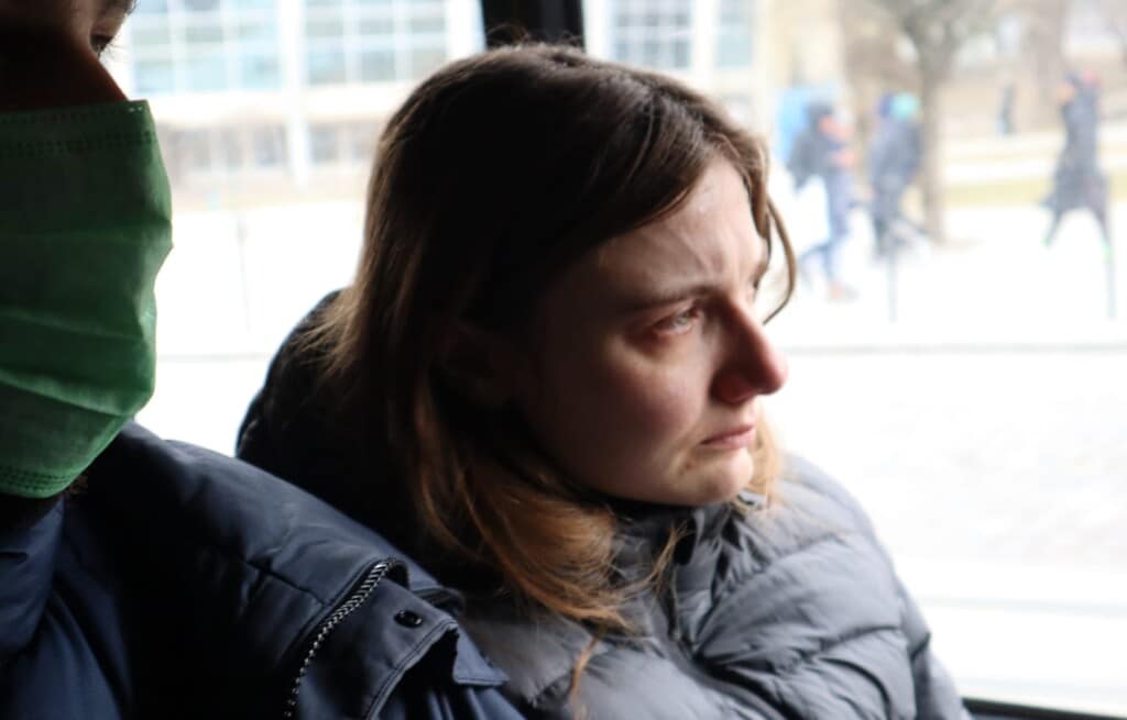 But it takes me hours and a dozen or so cigarettes to get this information out of him. Nick takes two drags and we hop onto an old yellow bus. People scroll on their phones and go about their work but the specter of war is never far away. Tears stream down a woman’s face as she squeezes her husband’s hand. We pass families dragging their luggage as it bounces along the spaces between cobblestones.