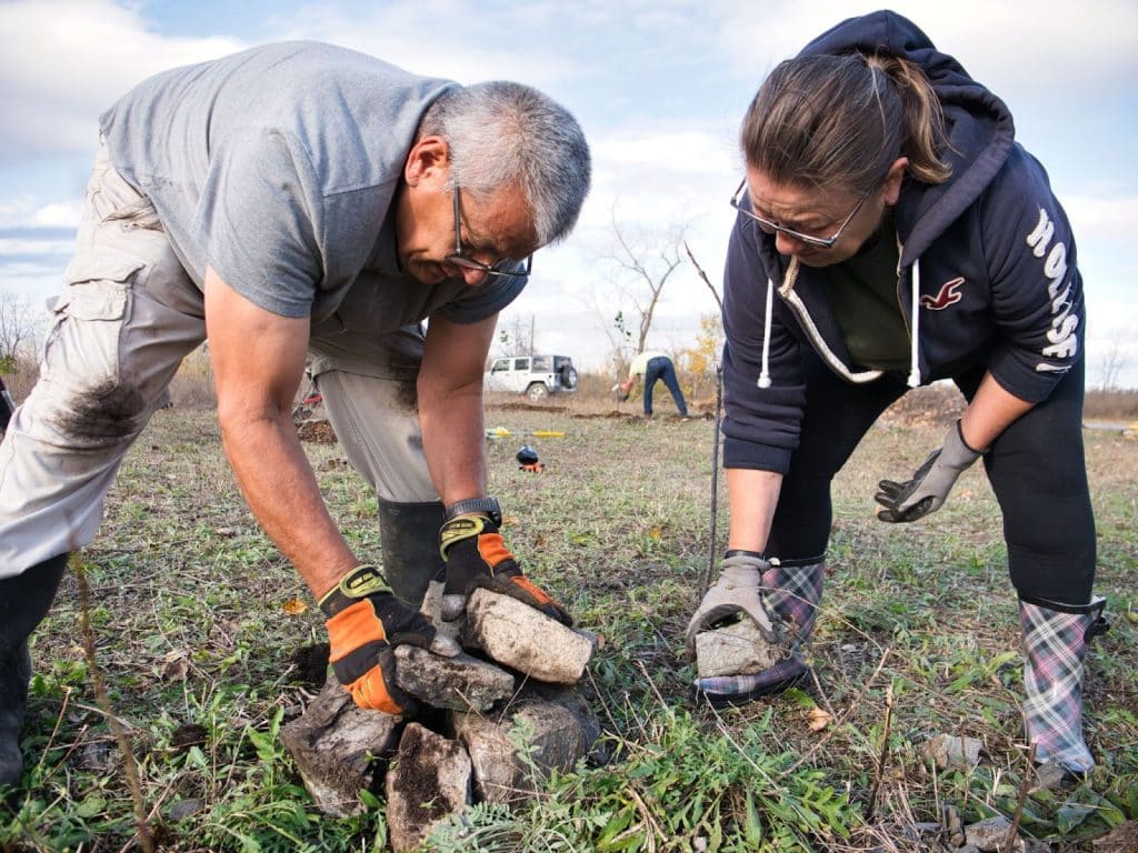 Sage Karahkwinetha Goodleaf, her niece, and Douglas Lahache plant together on Tekakwitha Island. PHOTO: Marieke Glorieux-Stryckman