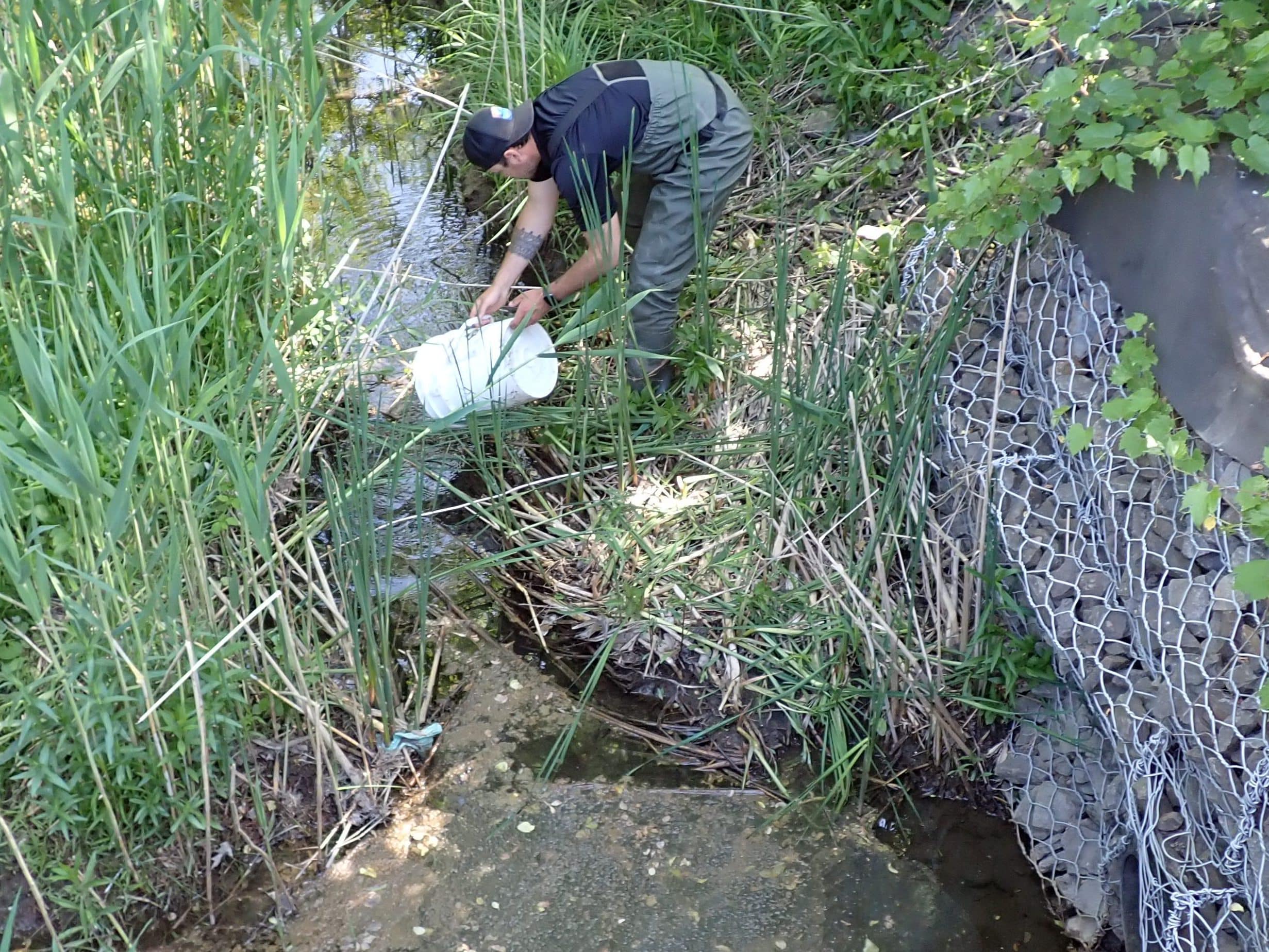Brandon Atéhrhanonhne Rice, Project Support Technician at KEPO, releasing fish in the North Creek. PHOTO: Courtesy KEPO