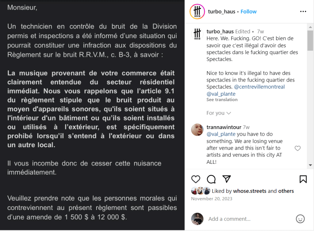 An example of the bullshit Da Silva is referring to is a noise complaint from the neighbouring building that led to a warning from the City of Montreal.